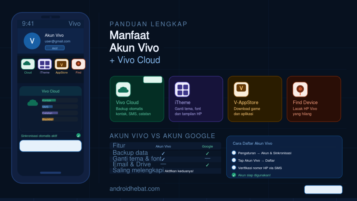 Akun Vivo bukan sekadar akun biasa — ini adalah kunci utama untuk mengakses ekosistem layanan Vivo secara penuh: dari Vivo Cloud untuk backup data, iTheme untuk kustomisasi tampilan HP, V-AppStore untuk download aplikasi, hingga Find My Device untuk keamanan HP kamu.